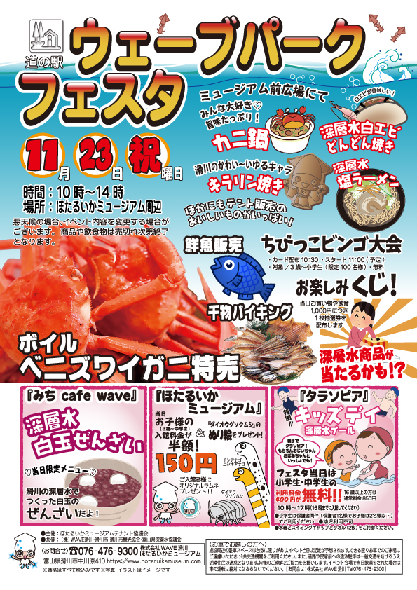 今週土曜日11/23(祝)、ほたるいかミュージアムにて【ウェーブパークフェスタ】が開催されます。
